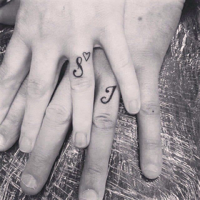 Tattooing each other’s initials on your ring fingers is a creative spin on classic wedding rings. These matching tattoos beautifully represent a deep bond and unwavering love.