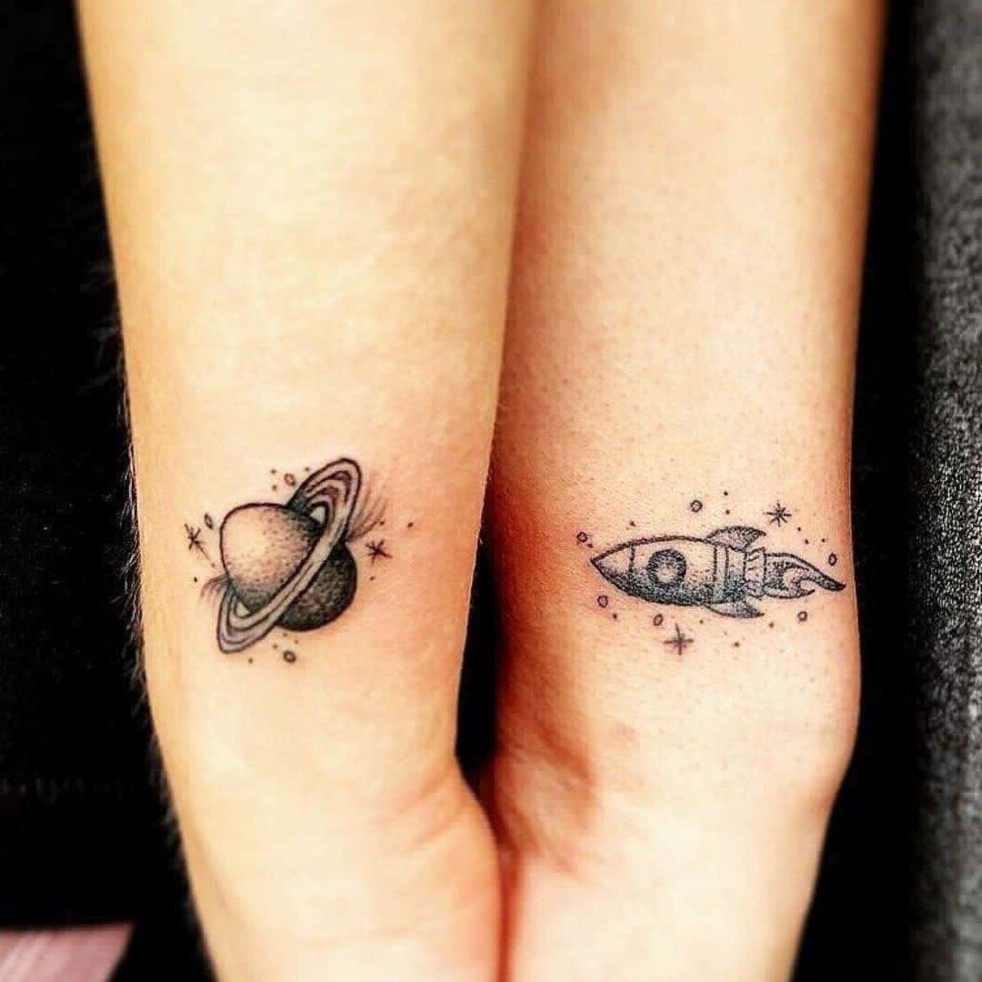 1. Cute Spaceship and Planet Couple Tattoos