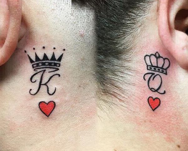 The area behind the ear offers a great spot for matching tattoos. You can explore various designs, like these lovely small king and queen tattoos for couples.