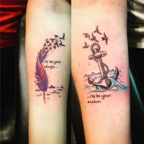 The lovely expressions ‘I’ll be your wings’ and ‘I’ll be your anchor’ inked on two people reflect their special connection. They provide stability for each other while simultaneously lifting each other up – perfect for soulmates!